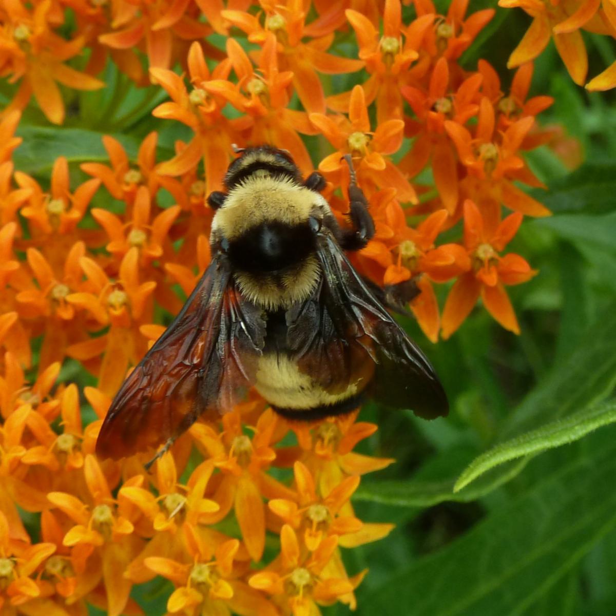 It is important to support all pollinator life stages, including eggs and larvae! For bees, leave patches of bare ground and brush piles, have plants and shrubs with hollow or pithy stems, or install nesting blocks. For butterflies and moths, plant their caterpillar host plants.
